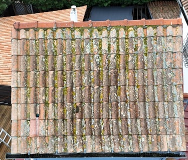 Pulvérisation d'un produit anti-mousse et hydrofuge préventif et curatif ; intervention sur tous types de couvertures : tuiles terre cuite ou béton, ardoises naturelles ou synthétiques, bac acier, zinc, shingle et autres matériaux de toiture.